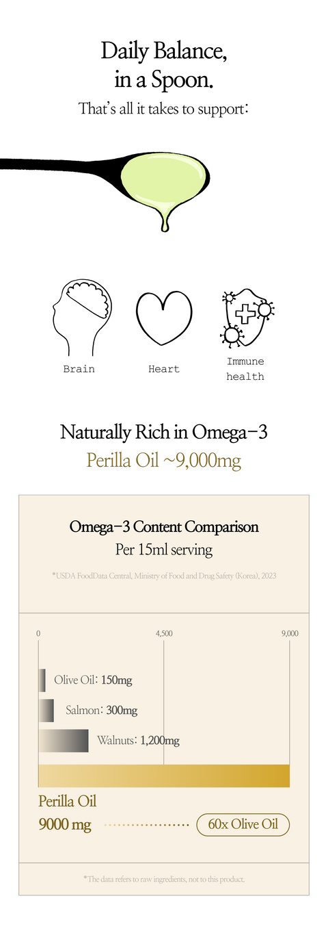 Unroasted, cold pressed at raw state, keeping the perilla seed’s natural grassy aroma and delivering the highest omega-3 content without heat degradation.